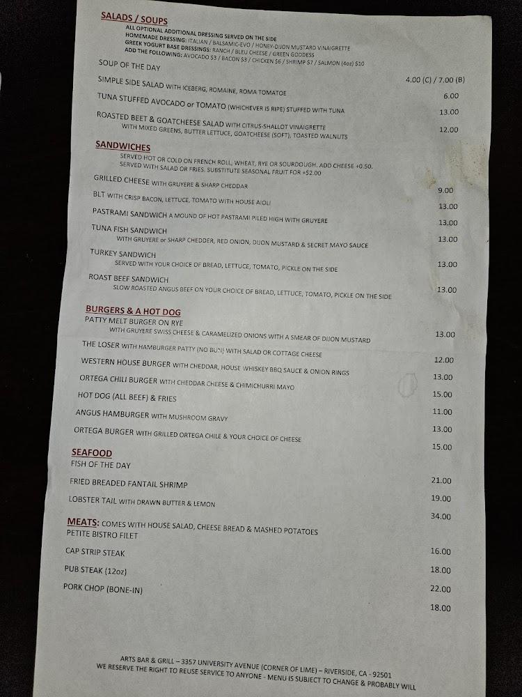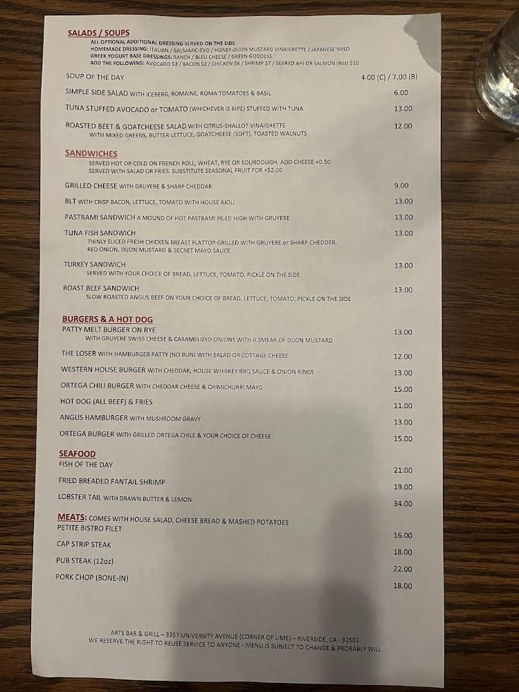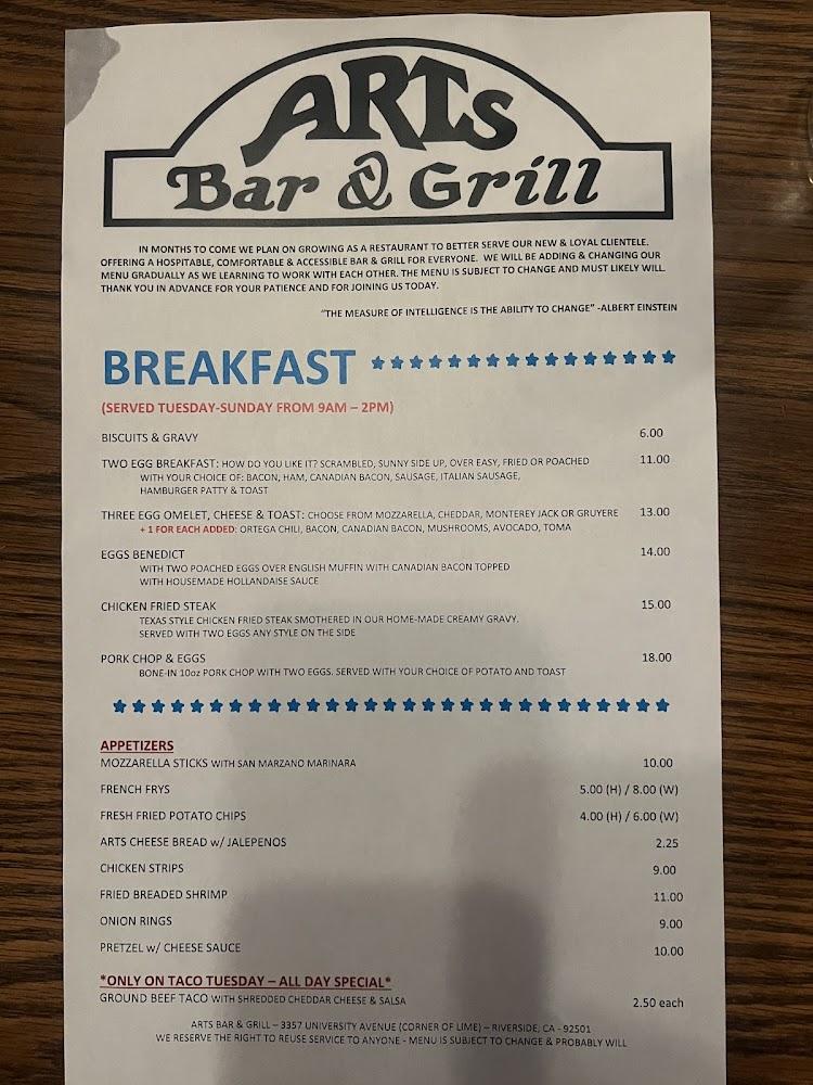 Welcome to Art's Bar & Grill, your go-to destination in Riverside for a relaxed dining experience. Located at 3357 University Ave, we offer a diverse menu featuring delicious grilled dishes and a wide selection of beer, wine, and craft cocktails. Enjoy our vibrant atmosphere with live concerts, karaoke nights, and exciting sports events. Whether you prefer dining in, takeout, or delivery, we’ve got you covered! Our welcoming space includes accessible parking and amenities, making it perfect for everyone. Join us for happy hour specials and savor the taste of community at Art's Bar & Grill—where good food and great times come together!